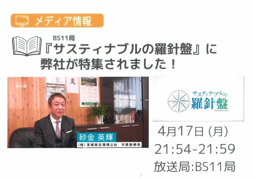 BS11のサスティナブルの羅針盤[4月14日(月)放送]で当社が紹介されました。5分番組となりますので、よろしければ下記URLよりご覧ください。サスティナブルの羅針盤は、社会/ 業界の課題解決に取り組む企業にフォーカスを当て、その目的や、実行の秘訣、未来に向けたメッセージを紹介する番組となります。今後も衛生環境を守り、サスティナブルな社会の実現に向けて、貢献してまいります。