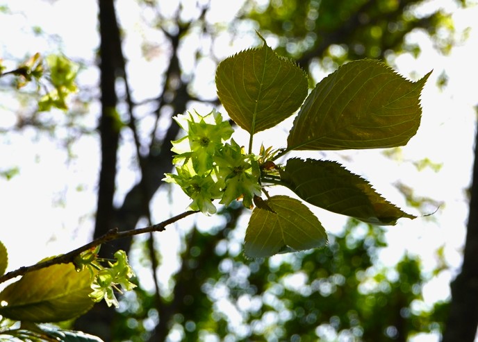 トップ画面の写真はぱっと見は若葉の桜の木が2本に見えますが、左の桜は花弁が黄緑色のため、若葉の桜の木に見えています。ここ数日前から咲き始め、今週くらいには満開になりそうです。仕事の合間に目に青葉で優しい黄緑です。