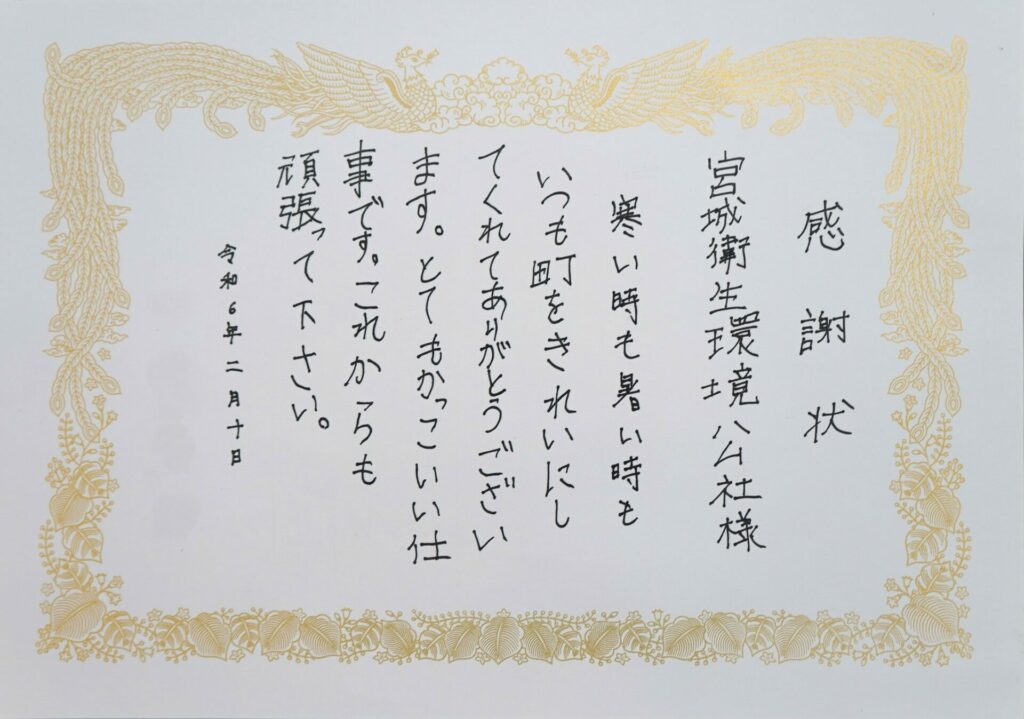 当社は家庭ごみ収集運搬を行っている業務もあり、市民の方々と触れ合う機会もあります。今回、市民のお子さんより感謝状をいただきましたのでご紹介します。私たち収集の運転手や助手の励みでもあり、笑顔が生まれる一つでもあります。これからも安全に、そして衛生環境を守るために努力いたします。感謝状ありがとうございました。