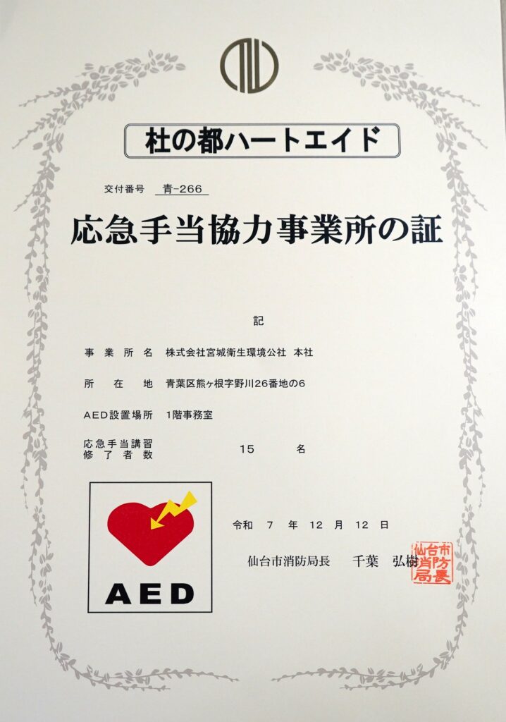 杜の都ハートエイド制度で「応急手当協力事業所の証」をいただきました(令和7年12月)