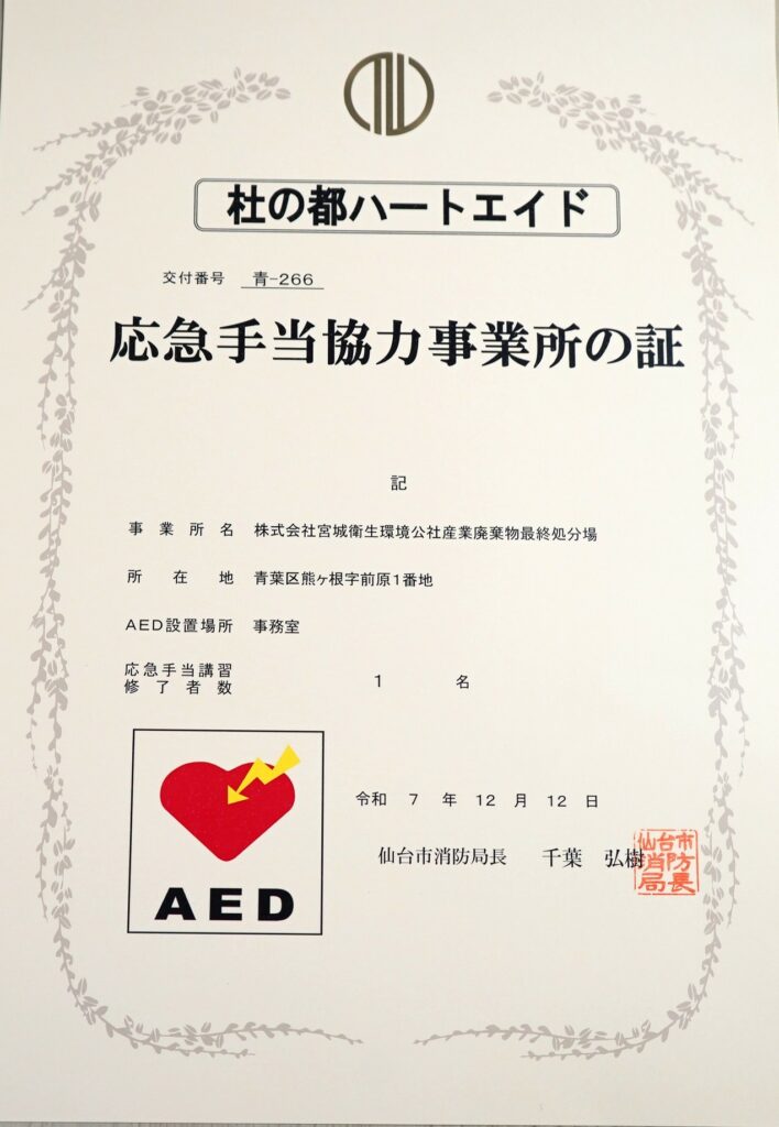 仙台市消防局が認定する「杜の都ハートエイド」は、事業所周辺で倒れている方や助けを求めている方に対し、救命講習を受講した従業員が事業所に設置されたAEDを持って現場に駆け付け、救急車が到着するまでの間、応急手当に協力する取り組みです。このたび当社では、計16名が応急手当講習を受講しました。正しい応急手当の方法を身につけることで、家族や同僚、そして地域の皆さまの大切な命を守る一助となることを目指しています。なお、当社は青葉区熊ヶ根字野川の本社および青葉区熊ヶ根字前原の安定型最終処分場の2か所が「杜の都ハートエイド協力事業所」として認定されており、それぞれ「応急手当事業所の証」を掲示しております。これからも地域に根ざした安全・安心な取り組みを継続してまいります。