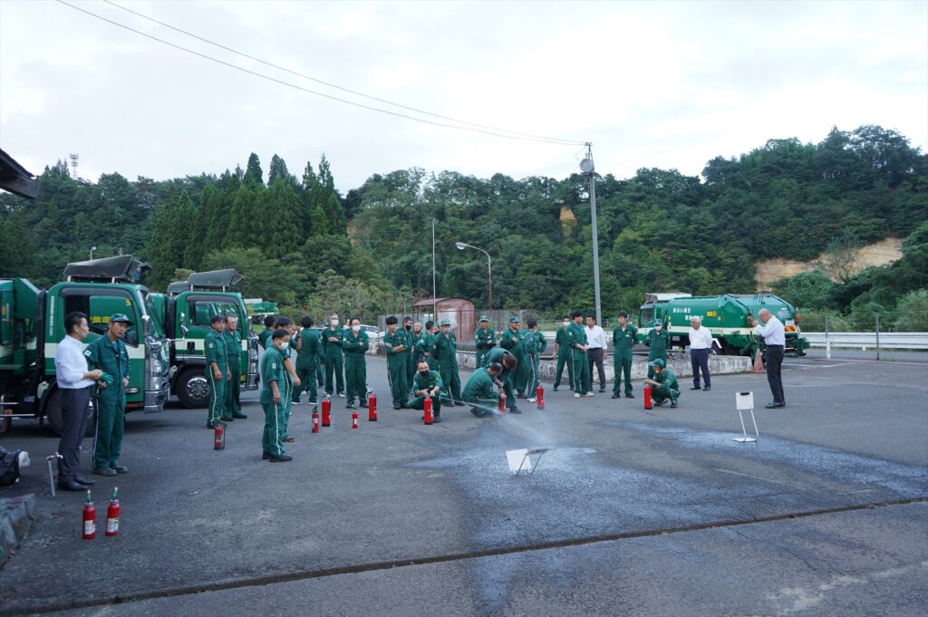 近年、ごみ収集車両等での火災のニュースが増えてきました。被害を大きくしないために、火災発見の場合は、延焼にならないように広い場所に移動し消火活動を行なうことが原則となっています。各車両に消火器を設置していますが万が一の時に慌てずに消火活動が出来るように消火器の取り扱いの訓練を9月12日(火)と14日(木)の2日間に分けて行いました。地域の消防団の社員が指導員になり、ピン・ポン・パン!ピンとピンを抜く、ポンとホースを外す、パンとレバーを押すという覚え方を教えてもらい消火作業の体験を行い、パッカー車の場合の火災の特徴などを共有しました。