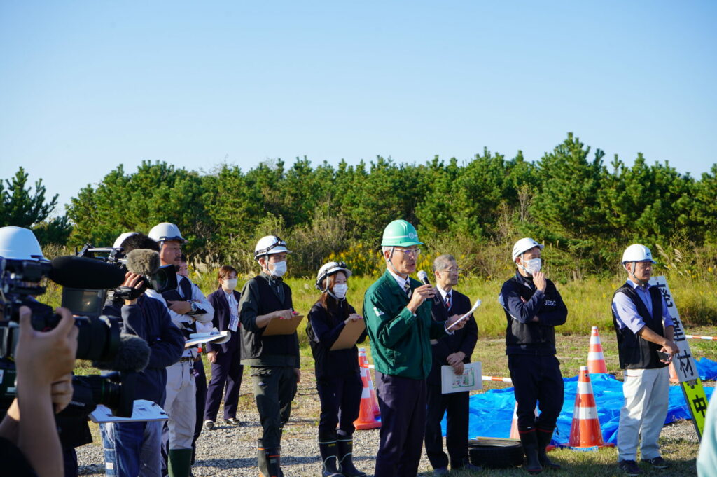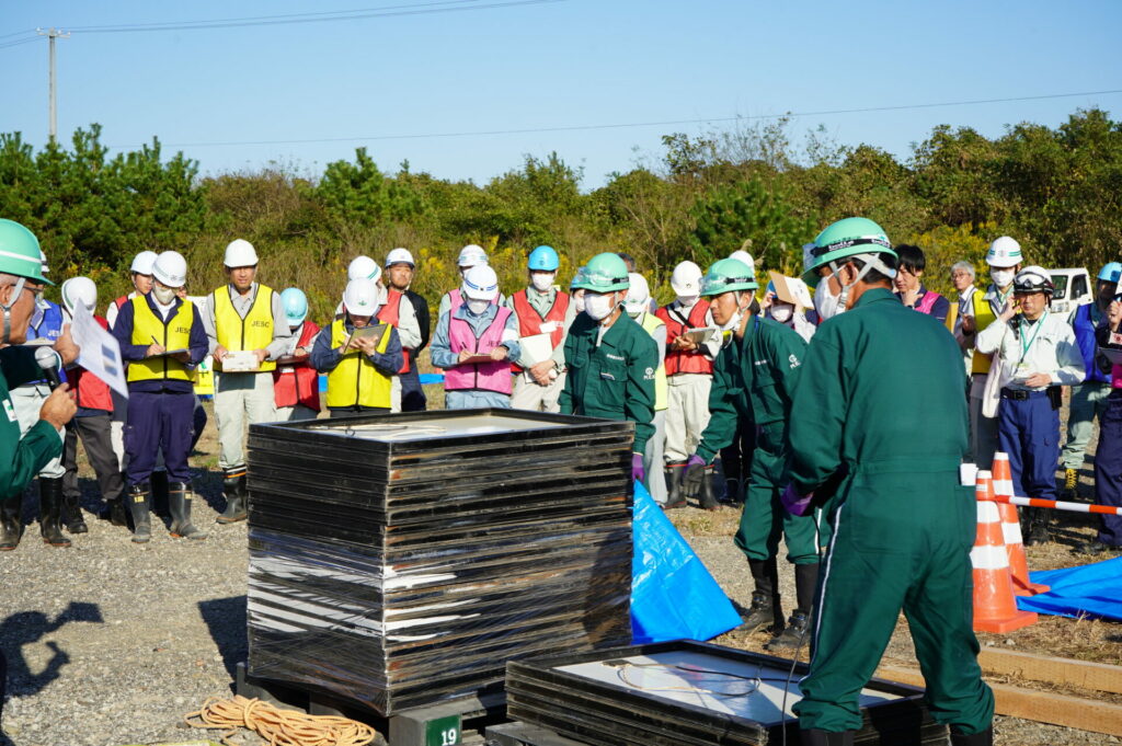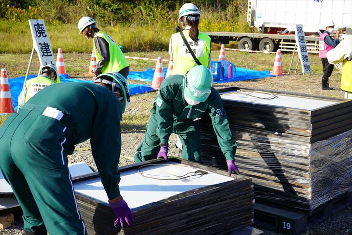 10月25日(金)に環境省と宮城県が主催する、災害時に発生する災害廃棄物の仮置き場を設置する訓練が、宮城県内で初めて行われました。東北各地の自治体職員などおよそ100人が参加しました。当社は、太陽光パネルの廃棄について、適切な受入れ方法の説明と、実際のパネルなど現物を用いて実演協力しました。