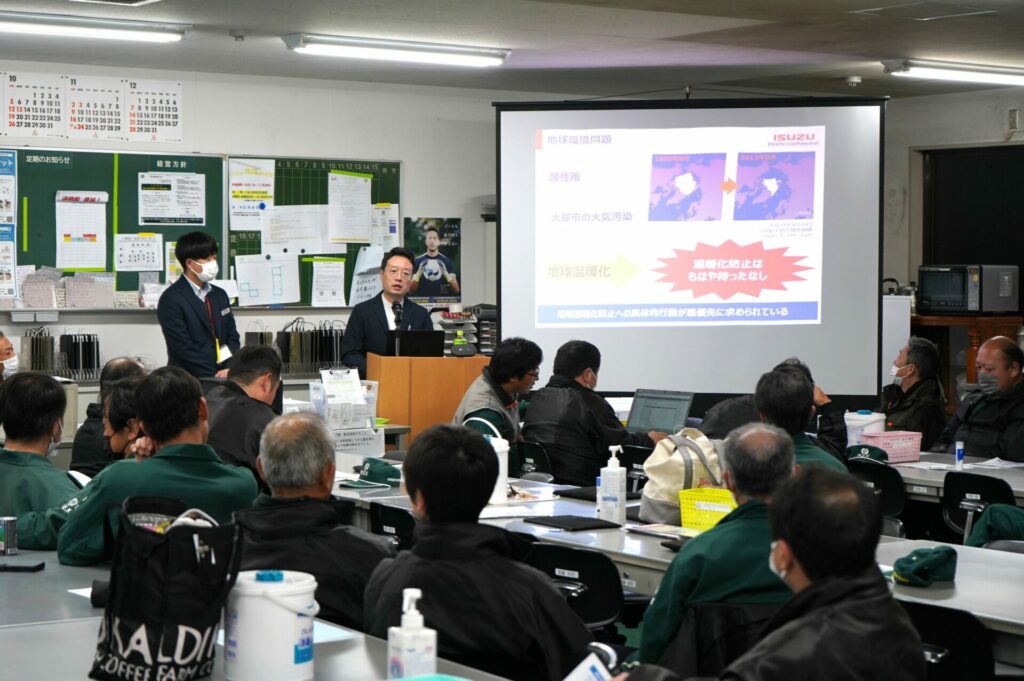 11月21日(金)、全社員を対象としたエコドライブ講習会を実施しました。いすゞ自動車東北株式会社様より講師をお迎えして、実践的かつ分かりやすいご指導をいただきました。講習では、近年の運輸業界を取り巻く環境の変化について触れながら、燃費改善や安全運転にもつながる早め早めのシフトアップなどを含めた 「エコドライブ6つのポイント」 を丁寧に解説していただきました。参加者は一人ひとりが真剣に耳を傾け、環境負荷の低減と業務効率の向上を両立させるための具体的な取り組みを学ぶことができました。