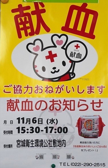 11月6日(水)に宮城県赤十字血液センターの献血車にお越しいただいて、社内献血協力を行いました。献血は他人の命を救うために重要な役割を果たし、災害や緊急時にも不可欠な資源として利用されます。そして血液は人工的につくることができず、長い期間保存することもできないそうです。今回は当社の社員と関連会社の社員の皆さん合計で15名で6000mlの献血になりました。献血によって、ひとりでも多くのいのちが救えることを願っています。