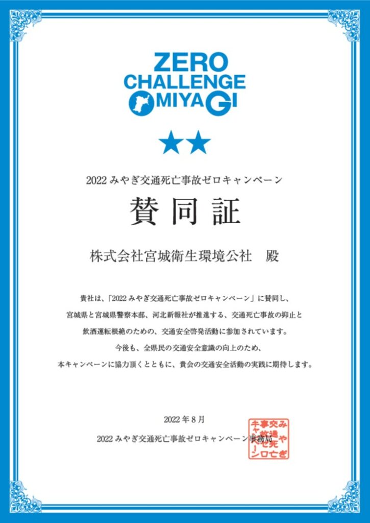 当社は、宮城県・宮城県警察本部・河北新報社が主催する「みやぎ交通死亡事故ゼロキャンペーン」に賛同し、交通死亡事故の抑止と、飲酒運転根絶のための、交通安全啓発活動に協力しています。当社はこれからも交通事故防止に積極的に取り組んでまいります。