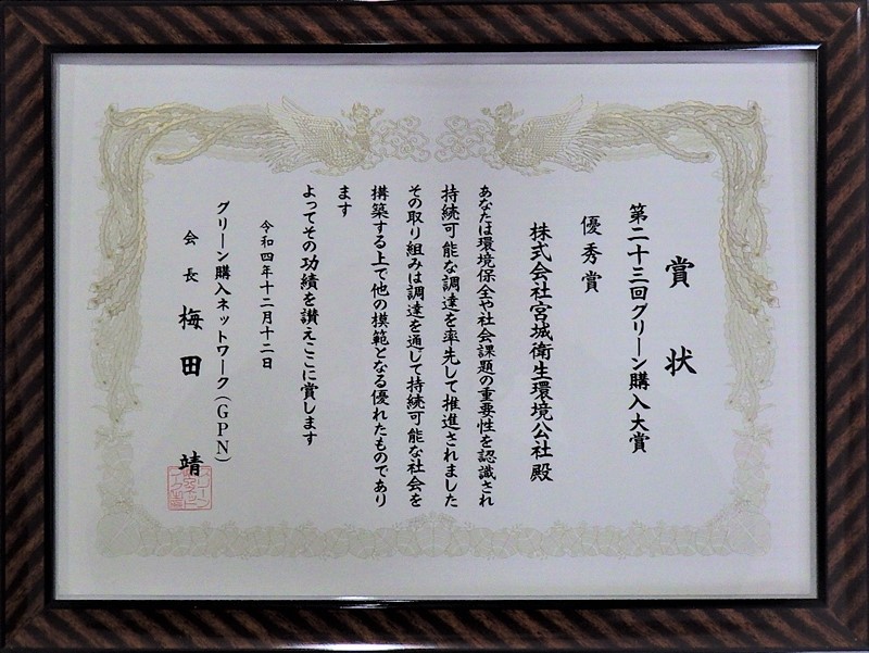 当社の脱炭素化に向けた様々な行動が評価され、気候変動アクション環境大臣表彰(令和4年12月5日)とグリーン購入大賞優秀賞(令和4年12月12日)を授かりました。どちらも全国の企業を対象としたもので、中小企業として2つの受賞は全国で当社のみとなります。これからも、持続可能な企業を目指し、なくてはならない企業として、人と社会に良い影響を与える環境、持続可能な企業を社員と共に創り上げてまいりたいと思います。