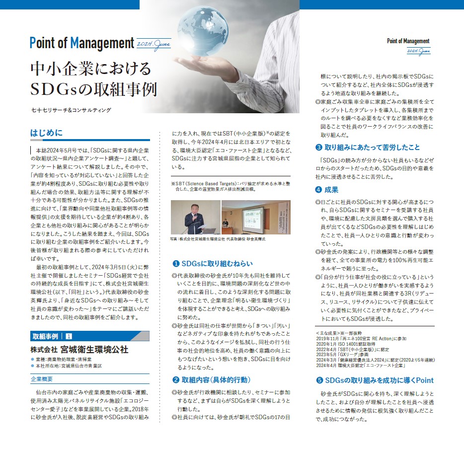 77R&C会員誌FLAG2024年6月号(発行:七十七リサーチ&コンサルティング株式会社)に中小企業におけるSDGsの取り組みが特集されました。その中で「SDGs経営で会社の持続的な成長を目指す」セミナー(2024年3月5日開催)で「身近なSDGsへの取り組み~そして社員の意識が変わった」と題した当社社長の講演内容が事例として掲載されました。
