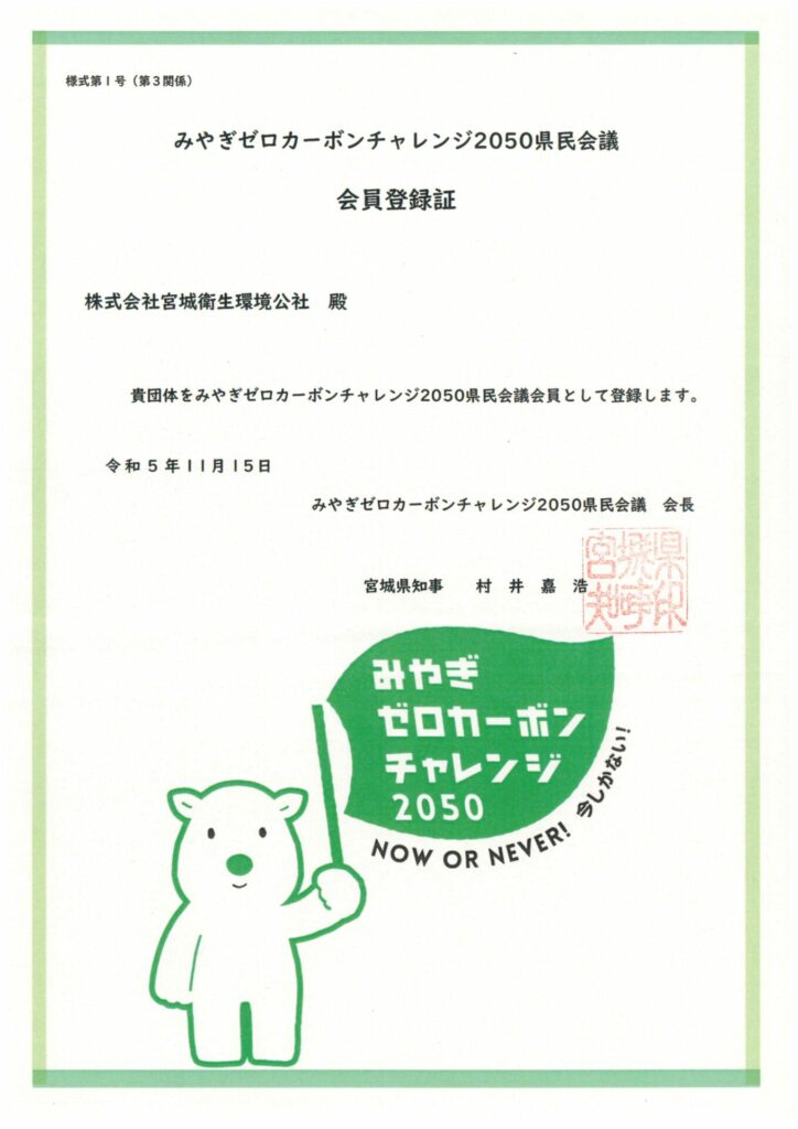 宮城県では、「みやぎゼロカーボンチャレンジ2050戦略」を策定し、2050年までに二酸化炭素排出実質ゼロを目標に、再生可能エネルギーの導入や省エネルギー化の推進など温暖化対策に取り組んでいます。目標達成に向けて、県民、事業者、行政が幅広く参加、連携し、地球温暖化対策を積極的に推進することを目的として「みやぎゼロカーボンチャレンジ2050県民会議」を設立し、当社も会員として参加しました。