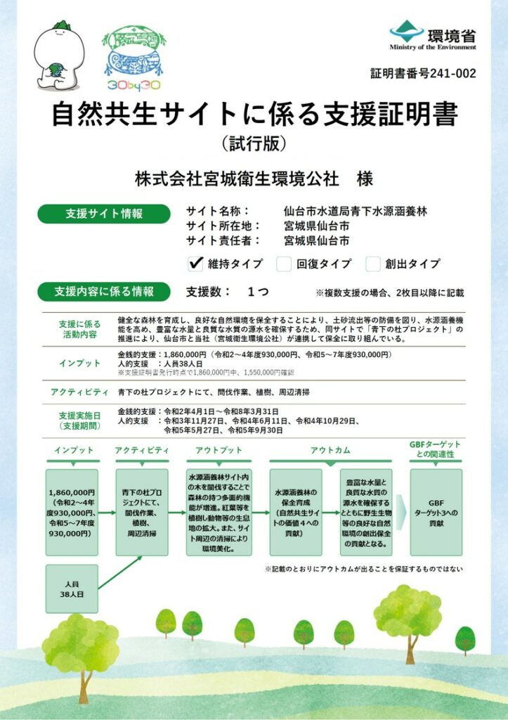 環境省では、生物多様性の保全に資する自然共生サイトへの支援を公的に認定するための支援証明書を令和6年度から試行発行しています。当社では、令和2年度より青下の杜プロジェクトとして官民連携で仙台市青下水源地水源涵養林保全活動を行なってきていますが、青下水源地が自然共生サイトとして令和6年3月に認定を受けたことにより、青下の杜プロジェクトでの活動内容が支援として認められ全国初の企業の一つとして名を連ねることになり証明書を頂きました。(全国では11件のみの証明発行)