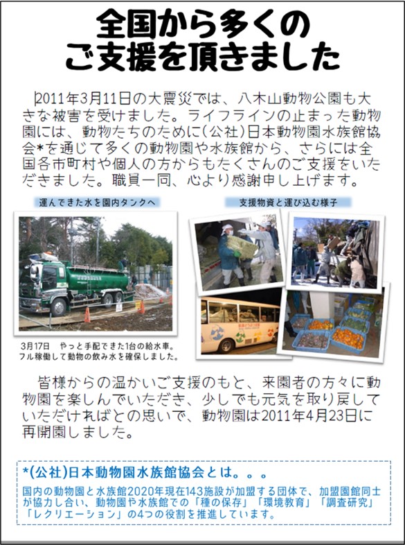 命の水と言われます。当時当社の社員と給水車が動物の命を救う一助になったと言っても過言ではないと思います。分け隔てなく全ての命を救う支援活動を行なったことは静脈産業の一員として大変誇らしいことです。このNEWSをお読みいただく皆さんにもこの誇らしい活動を知って欲しいと思い記事にしました。八木山動物公園へ行く機会がございましたら、是非、展示しているビジターセンターで足を止めてみてください。