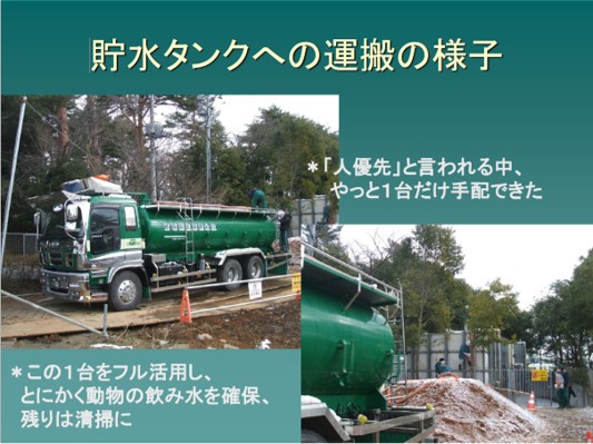 2011年3月11日東日本大震災が発生しました。当時はライフラインの断絶、社会すべてが混乱の状況でした。当社のごみ収集も混乱のなか業務の継続を行い、給水車も学校などでの給水活動を行ない日常生活の復旧支援のために尽力をしました。人のみならず動物も大変な状況で人的優先という中、当社は全ての命は平等という考えのもと、大型給水車で動物への水の供給を行いました。