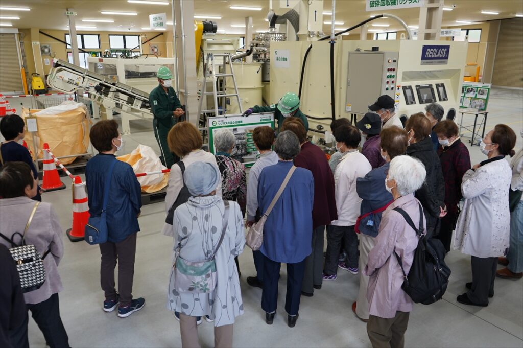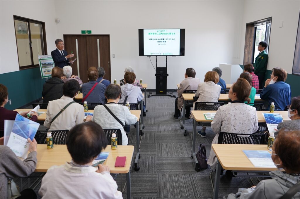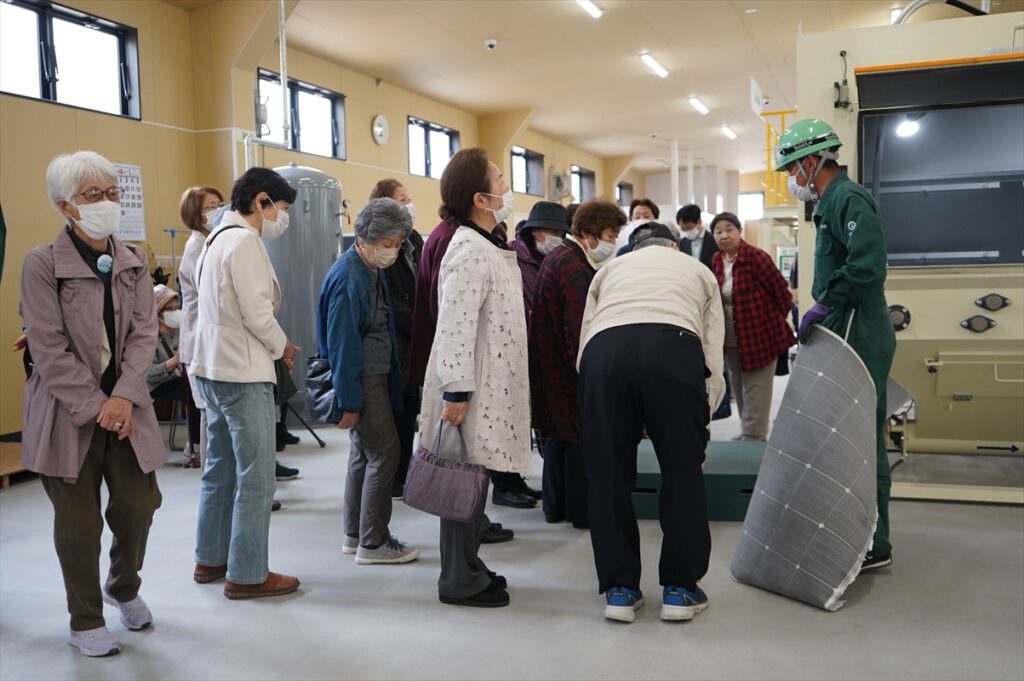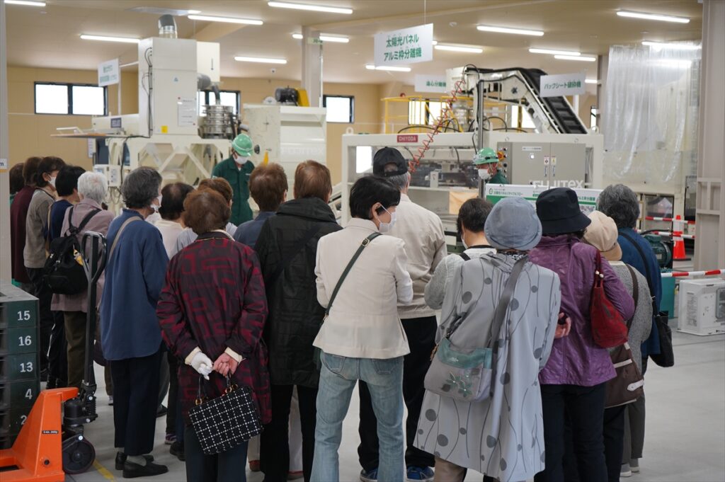 仙台市“環境施設見学”として令和7年度最初の見学団体がエコロジーセンター愛子に来ていただきました。4月24日(金)、総勢24名の町内会の皆さんがワケルくんバスで来所しました。現在の国内のエネルギーの状況による再生可能エネルギーの重要性などについて、そしてエコロジーセンター愛子の意義等を専務渡邊が説明し体験見学をしていただきました。太陽光パネルのリサイクル施設は県内で他にもあるのか?という質問もあり、太陽光パネルのリサイクルについて理解を深めていただきました。これからも資源循環の重要性を皆さんへ伝えていきたいと思います。
