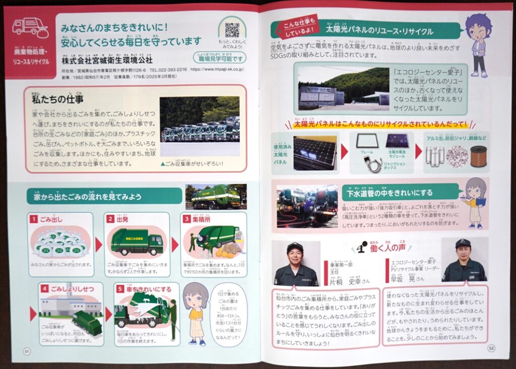 仙台市内小学3、4年生を対象にした“お仕事ノート”(副読本)に当社、廃棄物処理・リユース&リサイクルとして掲載されました。本冊子は、仙台市内の全小学校3、4年生へ配布され児童が希望を持って自分の未来を切り開くキャリア教育の授業などで活用されるものです。