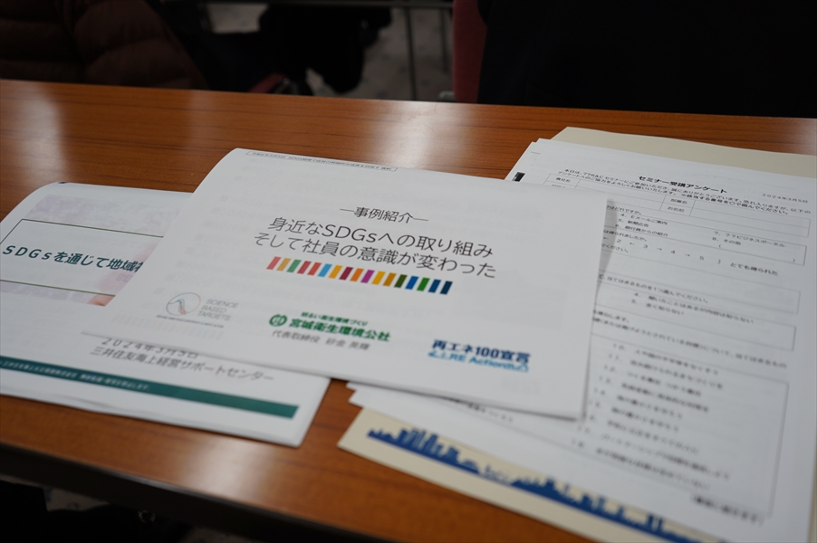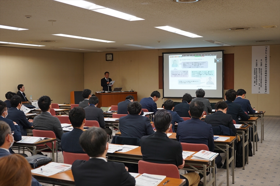 セミナー『SDGs経営で会社の持続的な成長を目指す』(主催:七十七リサーチ&コンサルティング株式会社 共催:株式会社七十七銀行、三井住友海上火災保険株式会社)が七十七銀行本店会議室で3月5日(火)に開催され、会場とオンラインで約65名の参加をいただき、第一部講演は「SDGsを通じた地域社会の課題解決」と題して、三井住友海上火災保険株式会社 竹内靖人様のご講演。そして、第二部として当社社長砂金が、「身近なSDGsへの取り組み~そして社員の意識が変わった~」と題して、事例紹介をさせていただきました。