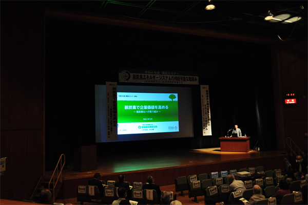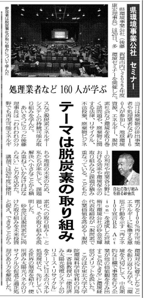 10月20日(木)に公益財団法人宮城県環境事業公社主催の環境セミナーにおいて、「脱炭素で企業価値を高める~ 脱炭素化への取り組み ~」と題して当社代表砂金が約160名の聴講者の皆さんの前で講演を行いました。当日は、廃棄物事業者の来場や、建設業の方々の来場が多く、脱炭素経営についての関心が高いことが伺えました。また、日刊建設新聞(10/22掲載)においても紹介され、当社の脱炭素化の取り組みが多くの方々の目にも触れることにもなりました。