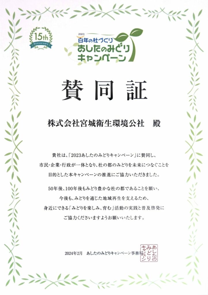 杜の都仙台にみどりを育むことを目的とした“あしたのみどりキャンペーン”(主催:河北新報社)。当社は2023年、本企画の趣旨に賛同し協賛をしております。この度、賛同の証として、賛同証を頂きました。当社では、広瀬川一万人プロジェクトなどの環境保全活動を通じ、自然との共生に積極的に取り組み、環境意識の深化を目指してまいりたいと思います。