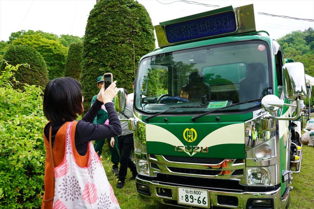 6月1日(土)に仙台市水道記念館で青下の杜フェスティバルが開催されました。当社では安全装置機能付きのパッカー車の展示を行い、運転席・助手席への搭乗体験の他に、ごみの投入体験、そしてごみ工場でのピット投入の様子のデモンストレーションを行いました。ごみの入っている架台部分が大きく上がると“おぉ~!”という歓声も上がり、来場者の皆さんに普段は見ることが出来ない光景で楽しんでいただけました。実際のごみ収集時では危ないので近づかないで、とお願いすることが多いのですが、今回は小さなお子さんも一生懸命投入体験をし、楽しい思い出になったと思います。当社のブースへお立ち寄り頂いた皆さん、ありがとうございました。