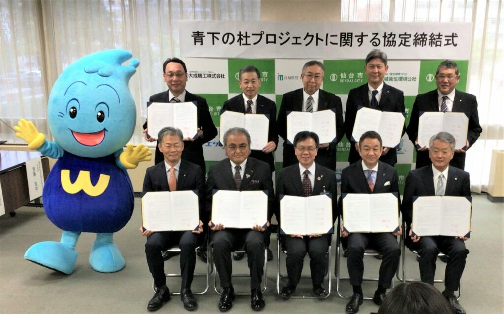 令和5年1月23日、仙台市役所において「青下の杜プロジェクト協定締結式」が開催されました。当社は、令和2年のプロジェクト発足時より森林保全・水源地保全活動の趣旨に賛同し、仙台市と協定を結んでおりますが、今回は令和5年度からの協定として締結しました。当社社長、砂金が仙台市水道事業管理者佐藤伸治様と協定書の取り交わしを行いました。