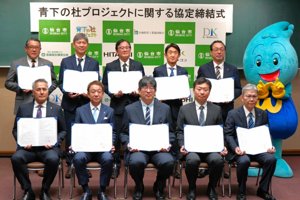 令和8年1月16日(金)、仙台市水道局本庁舎において「青下の杜プロジェクト協定締結式」が開催されました。当社は、令和2年のプロジェクト発足時より森林保全・水源地保全活動の趣旨に賛同し、仙台市と協定を結んでおりますが、今回は令和8年度からの協定として締結しました。当社社長、砂金が仙台市水道事業管理者 加藤邦治様と協定書の取り交わしを行いました。これからも協定を取り交わした企業の皆さんと一緒に、森林保全の活動を行い、青下水源地を守っていきたいと思います。