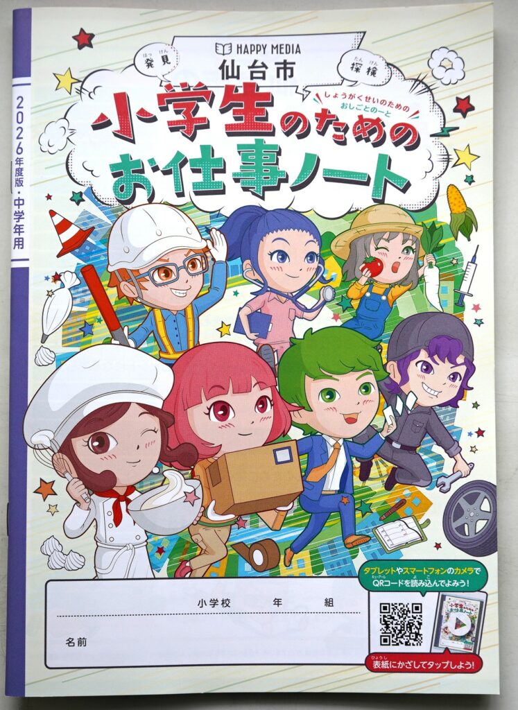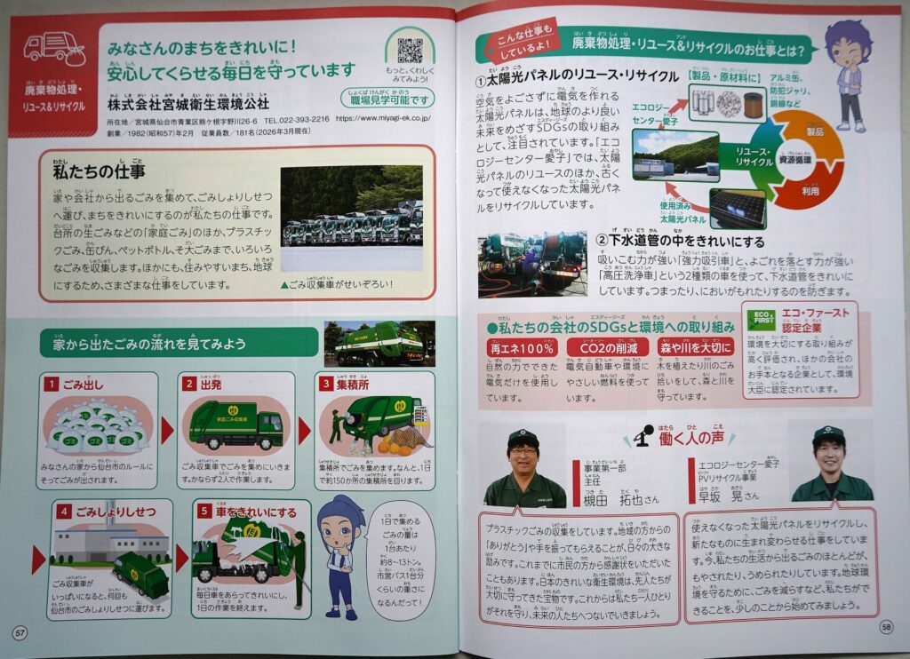 仙台市内小学3、4年生を対象にした“お仕事ノート”(副読本)に当社、廃棄物処理・リユース&リサイクルとして掲載されました。本冊子は、仙台市内の全小学校3、4年生へ配布され児童が希望を持って自分の未来を切り開くキャリア教育の授業などで活用されるものです。