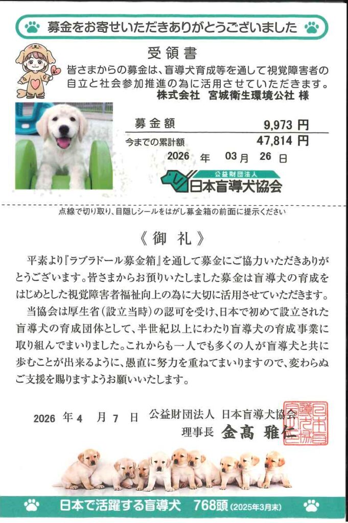 当社本社ではラブラドール募金箱を設置しており、従業員が少しずつ募金を重ねてきました。この度、募金箱がいっぱいになったため、日本盲導犬協会仙台訓練センター様へ募金をお届けしました。募金額は9,973円となり、累計では47,814円となりました。