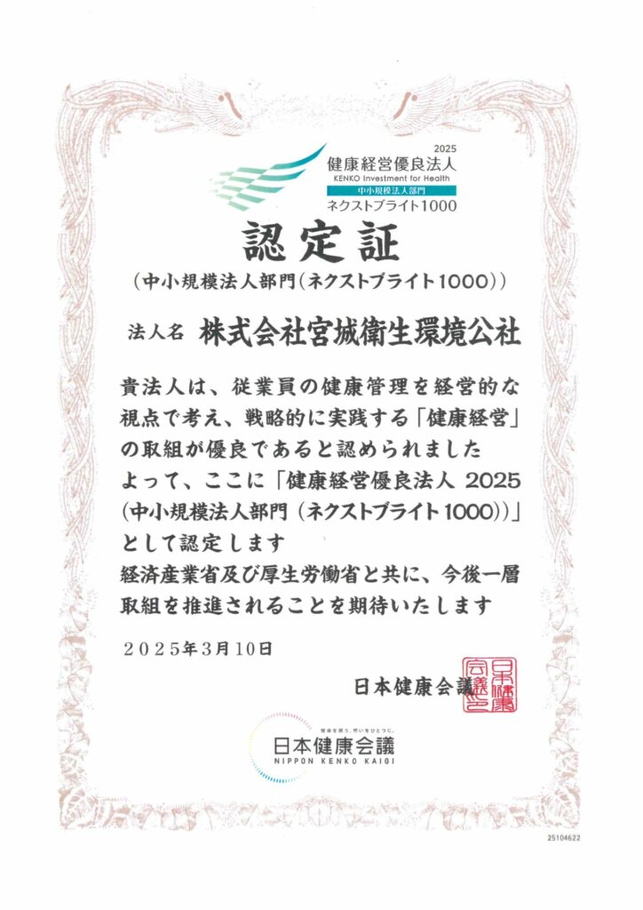 健康経営優良法人2025に認定されました(令和7年3月) 2025.03.11 令和7年3月に「健康経営優良法人2025(中小規模法人部門(ネクストブライト1000))」に認定され、当社は2020年より6年連続で認定をいただくことになりました。当社が認定を受けた2020年の宮城県の中小企業は90社でしたが、2025年は525社となりました。当社ではこれからも従業員の心と体の健康を考え、健康増進や生活習慣の改善を積極的に支え、職場からの応援を継続していきたいと思います。