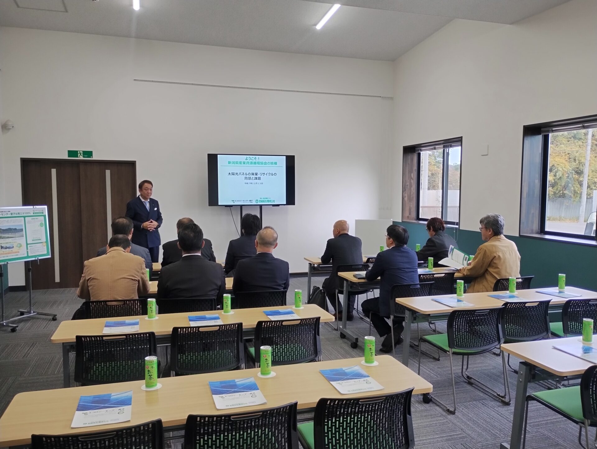 お越しいただいた皆様からは幅広い質問があり、特に使用済み太陽光パネルの処分に関する関心が高く示されました。本視察を通じて資源循環の重要性への理解が深まり、情報共有の場として大変有意義なものとなりました。新潟県産業資源循環協会 新発田支部の皆様、お越しいただき誠にありがとうございました。