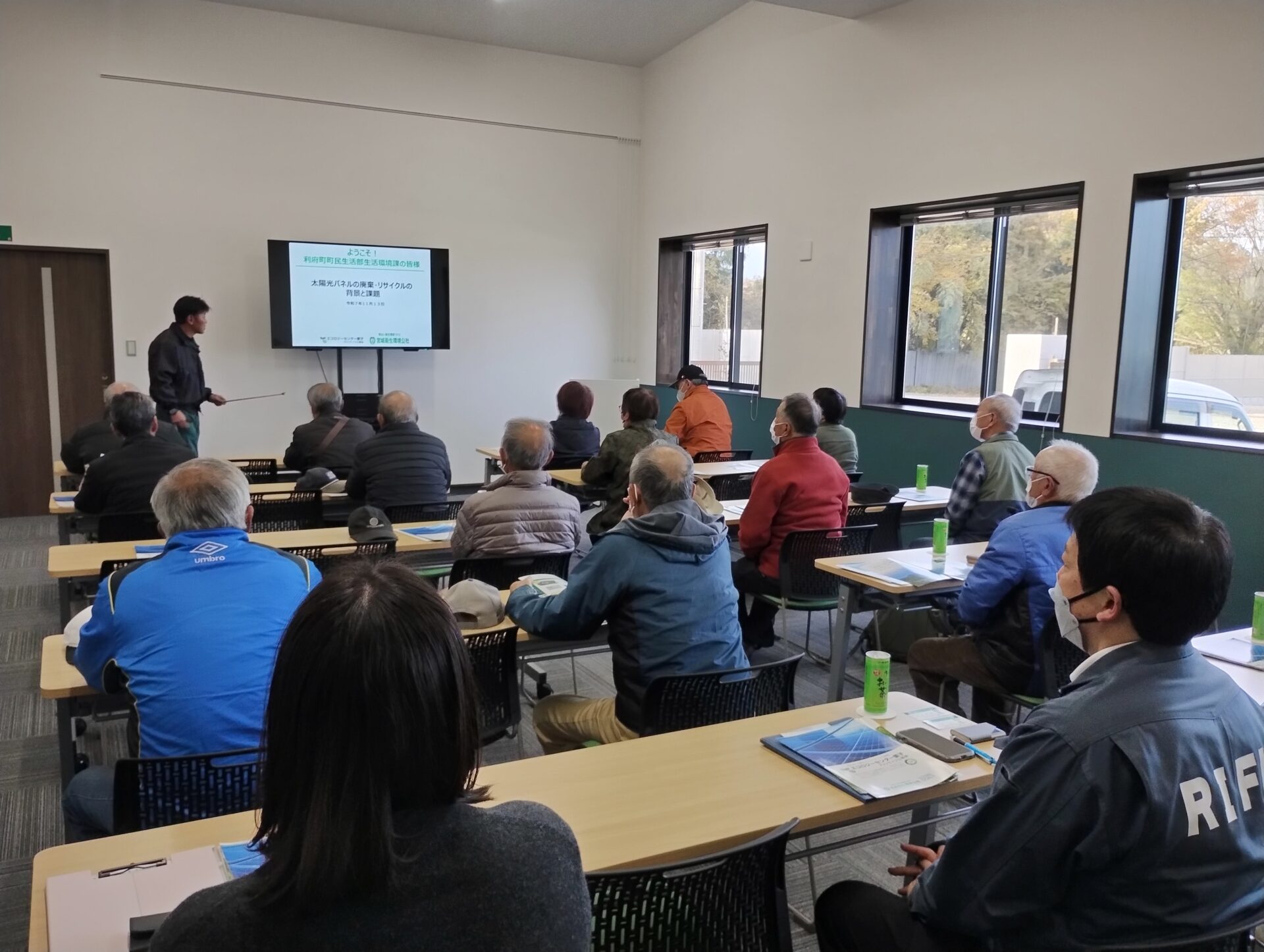 11月13日(木)、仙台市の「環境施設を見る会」に登録されているエコロジーセンター愛子に、利府町環境美化推進委員の皆さま18名が見学にお越しくださいました。当日は、当施設の概要に加え、再生可能エネルギーの重要性や、エコロジーセンター愛子が担う役割とその意義についてご説明しました。その後、施設内をご案内し、太陽光パネルのリサイクル工程を実際にご覧いただくことで、理解を一層深めていただきました。